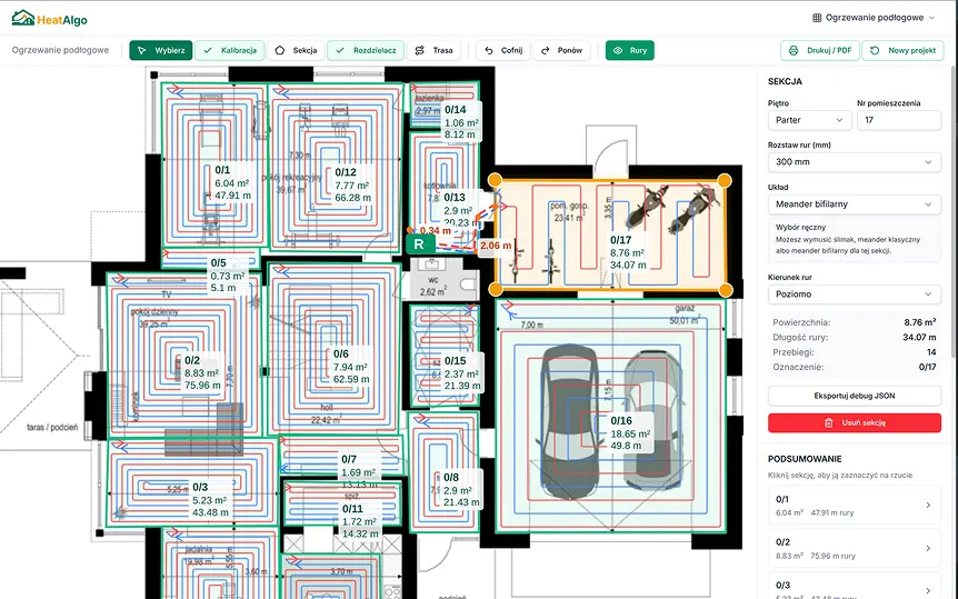 Wrzuć PDF lub zdjęcie od architekta, skalibruj skalę dwoma kliknięciami, narysuj strefy. Rysuj układ rur na podkładzie, a obliczenia aktualizują się na bieżąco: pole, długość rury, ostrzeżenie przy pętli powyżej 100 m.
